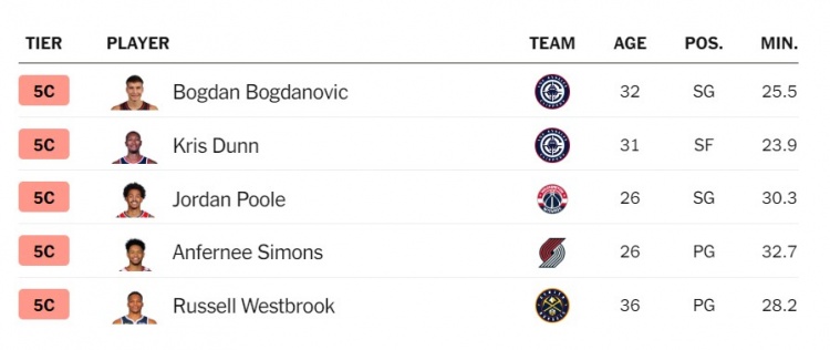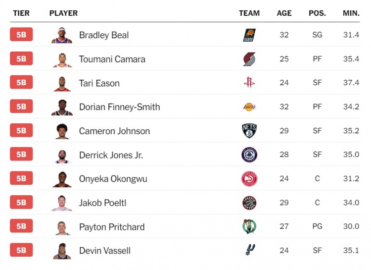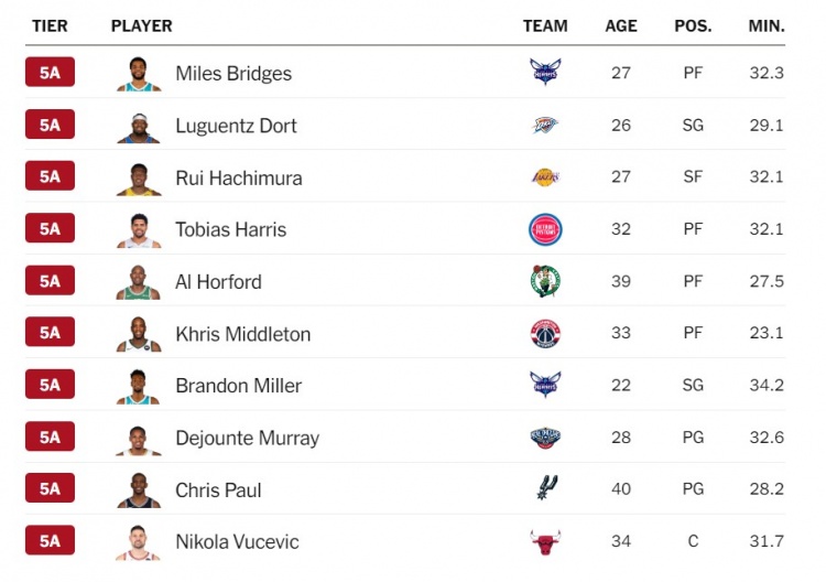 奥博直播4月15日讯 常规赛结束之际,美媒The Athletic推出了他们的季终球员分档,评选出了联盟中最好的125名球员。今天发布的是101-125名的球员。 被评为5A的球员有:小桥、多特、八村塁、哈里斯、霍福德、米德尔顿、布兰登-米勒、德章泰-穆雷、保罗、武切维奇。 被评为5B的球员有:比尔、卡马拉、伊森、芬尼-史密斯、卡梅隆-约翰逊、小琼斯、奥孔武、珀尔特尔、普理查德、瓦塞尔。 被评为5C的球员有:博格丹、邓恩、普尔、安芬尼-西蒙斯、威少。