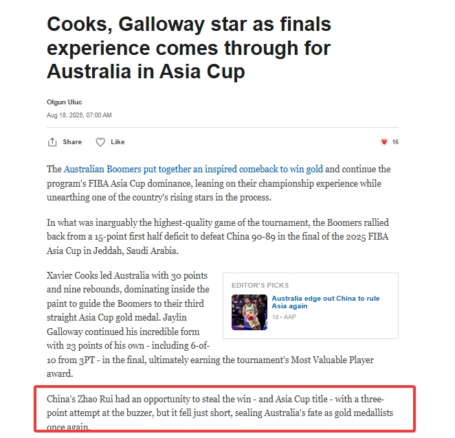 奥博直播08月19日讯 2025年男篮亚洲杯决赛,中国男篮以89-90惜败卫冕冠军,摘得银牌。 比赛最后时刻,中国男篮执行进攻战术,廖三宁边线发球传给远端的胡明轩,小胡得球晃起对手后出手绝杀三分磕筐而出。 ESPN名记、澳大利亚篮球记者Olgun Uluc撰文报道亚洲杯决赛时大乌龙,他将胡明轩认成了赵睿,文章中第四段如下: 中国队的赵睿本来有机会在终场哨响前投进三分,偷走胜利和亚洲杯冠军,但最终功亏一篑,澳大利亚再次锁定成为金牌得主的命运。
