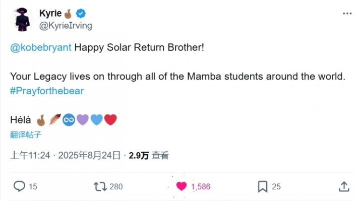 奥博直播08月24日讯 当地时间今天是科比的47岁生日,凯里-欧文刚刚更新了推特给科比送上生日祝福。 “@kobebryant 生日快乐兄弟!你的传奇永远存在在全世界的曼巴门徒心中!#为那只熊祈祷 Hélà ” 科比:如果你看到我和熊在搏斗,为那只熊祈祷。